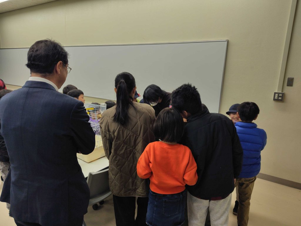 研究室訪問(清水窪小学校) 投稿日: 2026年1月27日2026年1月30日 投稿者: 小林愛実 清水窪小学校3年生の研究室見学を受け入れました。はじめに二階堂先生の模擬授業があり、その後、①水槽部屋見学 ②二階堂先生への質問 ③ハリネズミの観察 の3つをグループに分かれて行いました。 ↑水槽部屋の見学。ポリプテルス、透明ナマズ、ティラピアが人気でした。 ↑二階堂先生への質問。先生が昔飼っていたペットに関する質問も飛び出ました。 ↑ハリネズミの観察。
