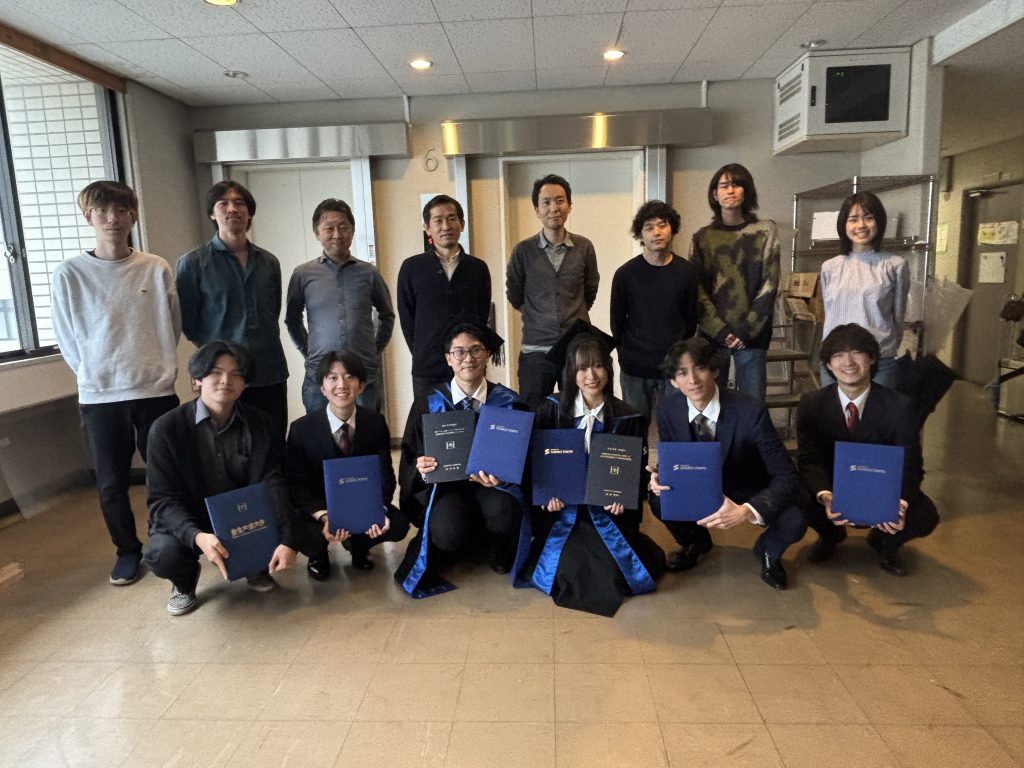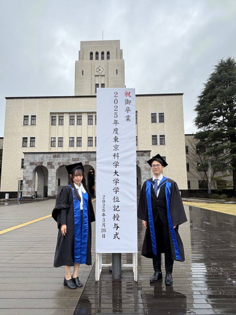 学位授与式!! 投稿日: 2026年3月26日2026年3月26日 投稿者: 小林愛実 2026年3月26日、東京科学大の学位授与式がありました。 二階堂研からは博士2名、修士2名、学部1名が参加しました。 D3の西浦さん(左)とD3の待井さん(右) 西浦さんは生命理工学院の総代でした! M2の深堀さん、野口さんは就職し、B4の德元くんは修士課程に進学して二階堂研で研究を続けます。 ラボのムードメーカー4人がいなくなってとてもさみしいですが、飲み会でまた会えるのを楽しみにしています。 ともに過ごした日々を胸に抱いて未来の空へ飛び立っていってください!!